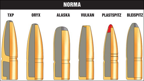 «Трофи экспансивная линия». Охотничья экспансивная пуля высокого действия. Она пригодна для охоты на крупного зверя типа африканского буйвола. В принципе, эта пуля повторяет конструкцию Nosler Partition, но имеет отличие. Для улучшения кучности центр тяжести смещён к хвостовой части. Сделано это весьма оригинально. Ведущая часть составляет около 1/3 длины пули за счёт переобжима головной части. В месте перехода головной части в ведущую, образован уступ, на котором дополнительно обжимается дульце гильзы. Таким образом, увеличивается усилие страгивания пули, а значит, увеличивается полнота сгорания порохового заряда. Необходимо отметить, что уступ является характерной чертой всех «настоящих» пуль Norma.